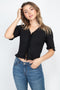 - A knit ribbed mini dress, solid color, v-neckline with front knot, short sleeves, and a bodycon silhouette.
