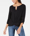 Your fashion sense takes a step up with BCX's ruched-side top, detailed with cold-shoulder cutouts and twisted ladder-strap accents.